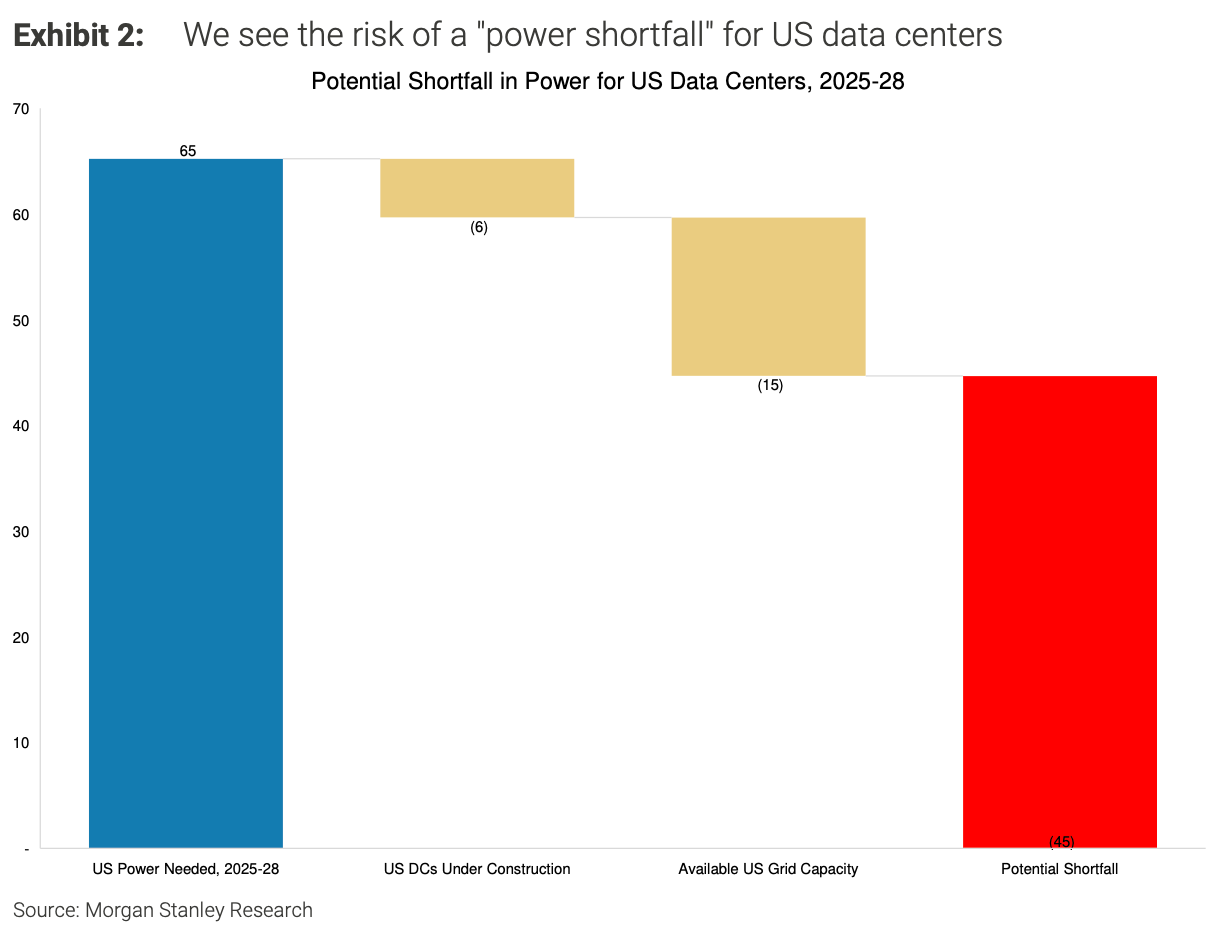 בכחול אפשר לראות את היקף החשמל שמורגן סטנלי מעריכים שמרכזי נתונים יצטרכו, בצהוב (6) אלה פרויקטים שכבר קיבלו אישור/נמצאים בהקמה, בצהוב (15) זה החשמל שהרשת האמריקאית יכולה להוסיף למרכזי הנתונים בלי לבנות תחנות חדשות או הרחבות משמעותיות וזה הסימן הגדול ביותר לצוואר הבקבוק המרכזי. הרשת פשוט לא נבנתה לקצב כזה של ביקוש. בגרף האדום רואים את המחסור נטו בחשמל.