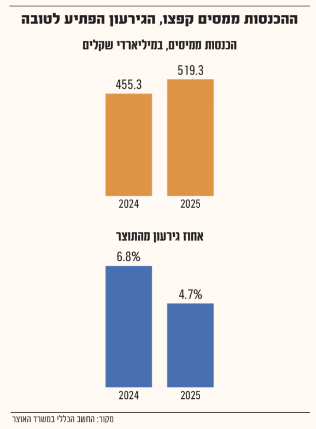 פורסם השבוע נתוני ביצוע התקציב לשנת 2025, הפרסום מגיע בתום שנתיים אינטנסיביות של טלטלות בזירה הביטחונית, הפנימית והגיאופוליטית, מה שגרם למתן תחזיות פסימי עקב אותה חוסר וודאות וקשיים שליוו את המשק בשנתיים האחרונות. על רקע אי הוודאות המתמשכת שליוותה את המשק, השורה התחתונה שמציג האוצר היא גירעון של 4.7% בלבד. הנתון הזה מעיד על חוסן כלכלי בסיסי, אך הוא מחייב קריאה זהירה ומעמיקה כדי להבין האם מדובר בשינוי מגמה יציב או בתוצאה של נסיבות נקודתיות. בסקירה הבאה נבין יחד איך קרה הדבר, איך למרות הגדלה בהוצאות המדינה, הגירעון נקטן אל מול הציפיות, מאיפה הגיע הכסף והאם אפשר לפתוח שמפניות?